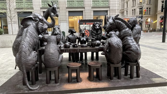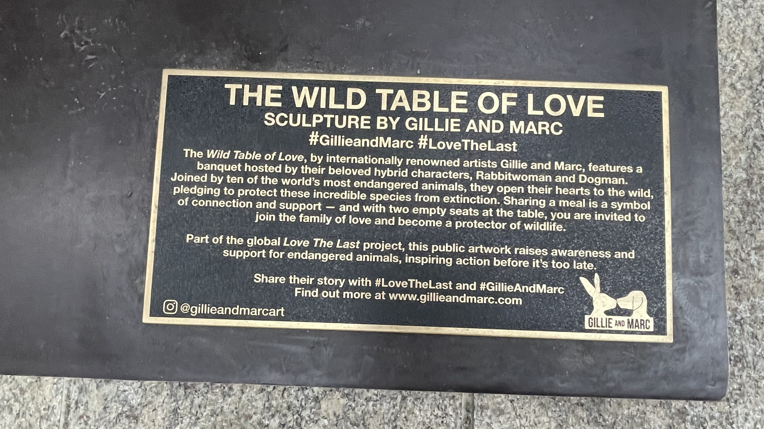 Redacción | NYL.- La escultura The Wild Table of Love (La mesa salvaje del amor), se ha convertido en una de las intervenciones artísticas contemporáneas más llamativas del sur de Manhattan, tanto por su dimensión visual como por el mensaje ambiental que transmite. Esta obra, creada por los artistas australianos Gillie y Marc, forma parte de una serie internacional de instalaciones dedicadas a concienciar sobre la protección de especies en peligro de extinción.